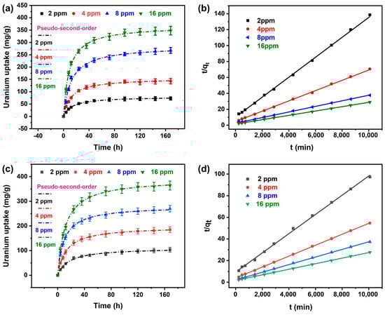 The U-adsorption kinetics of the ZW-PAO hydrogel and the pseudo-second-order in 2, 4, 8, and 16 ppm U-added (a,b) pure water and (c,d) seawater. All the solutions were adjusted to pH = 6 prior to U-adsorption.