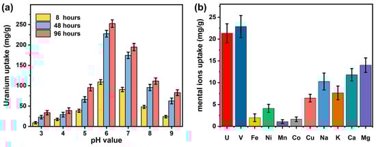 (a) U-extraction capacity as a function of pH in pure water containing 8 ppm U; (b) selective adsorption of metal ions by the ZW-PAO hydrogel.