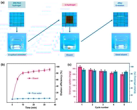 In order to verify the recyclability of U-adsorption by the ZW-PAO hydrogel, a cyclic adsorption–desorption experiment was conducted (Figure 6). After 10 mg of adsorbent was adsorbed in seawater with 16 ppm U for 48 h, rapid desorption of the hydrogel in eluent took place for 35 min. It is interesting that, after elution, the ZW-PAO hydrogel recovered from reddish to transparent (Figure 6a), which indicated the high desorbing rate. The desorbing rate of the first desorption reached 91.6 ± 3.8% (Figure 6b). The ZW-PAO hydrogel was subjected to five cyclic adsorption–desorption experiments (Figure 6c). Compared with the initial adsorption capacity of the hydrogel at 316.8 ± 11.2 mg/g, the regenerated hydrogel could maintain 251.2 ± 13.8 mg/g of U-adsorbing capacity, and the desorbing ratio could maintain 85.7 ± 2.8% after five cycles, which indicated that the ZW-PAO hydrogel had excellent U-adsorption reusability.