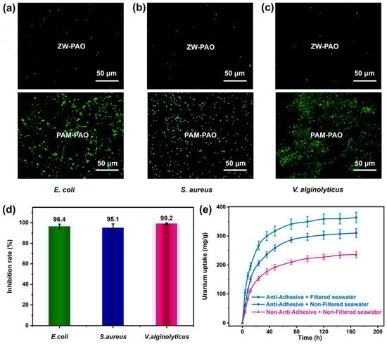 (a–c) The confocal laser microscopy of different ZW-PAO and PAM-PAO hydrogels; (d) the antibacterial rates of the ZW-PAO hydrogel against three types of bacteria; (e) the enhanced U-adsorption capacity of the ZW-PAO hydrogel by the improved anti-biofouling in seawater.