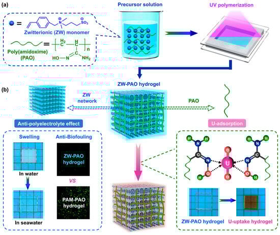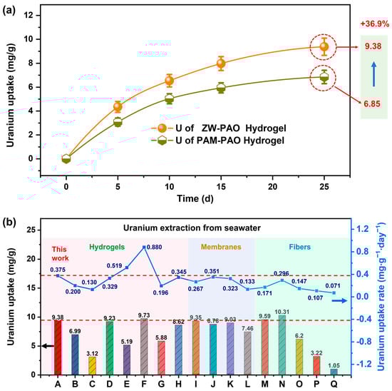 (a) Comparison of real seawater adsorption kinetics between ZW-PAO and PAM-PAO hydrogels; (b) comparison of uranium extraction rate between ZW-PAO hydrogel and existing amidoxime-group adsorbents [,,,,,,,,,,,,,,,].