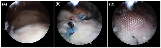 Right shoulder observed from the lateral portal. (A) Demonstrates a large tear at the level of the glenoid. (B) Rotator cuff repair prior to the addition of the synthetic PLLA scaffold. (C) Placement of the scaffold with medial sutures and anchors. Reprinted with permissions from [66].