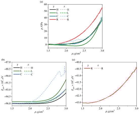 Figure 1a presents the pressure-density curves obtained during the compression of the GA along the y-axis (solid lines) and the z-axis (dashed lines). It is observed that the pressure is zero when < 1.75 g/, for all the considered GAs. This happens due to the collapse of the cells. For such GAs, it is better to consider the density of the structure rather than the strain, because due to the pores achieved strain can be very high. The curves for H, L and C can be divided into four parts: zero stress, a linear elastic, yielding and densification parts, which are similar observations to those of other works on the compression of silica and carbon aerogels [,,]. In all cases, the rigidity of the GA increases with its density, due to the formation of new van der Waals bonds (for H, L and C) and covalent bonds between neighboring GFs (for R). This behavior is explained by the special mechanical response of the graphene network to the compression []. For compression to density > 3.0 g/, amorphization of the GA occurred.
