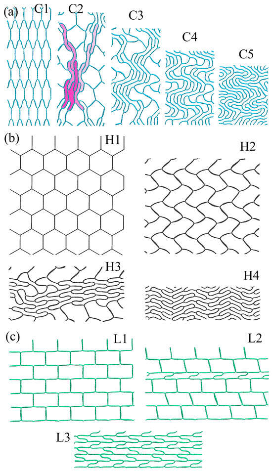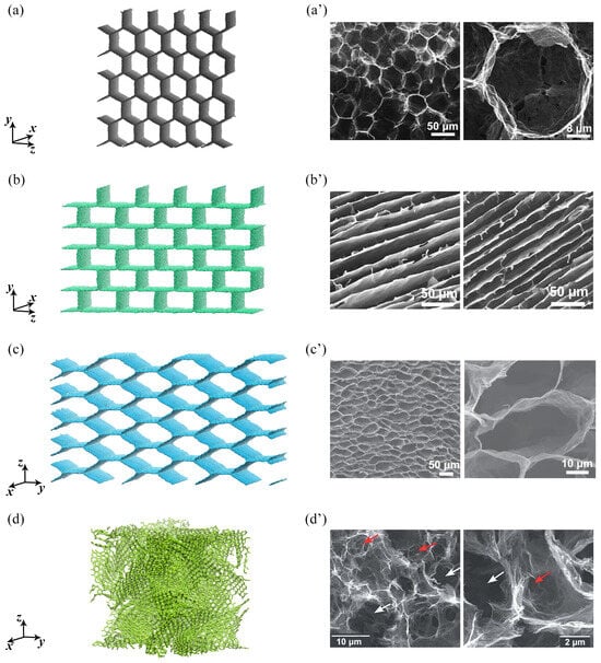 Figure 7 presents the GAs under consideration: Figure 7a,a’ H—honeycomb; Figure 7b,b’ L—lamellar; Figure 7c,c’ C—cellular; and Figure 7d,d’ R—GA with randomly oriented GFs. Here, Figure 7a–d are the model representations of Figure 7a’–d’ experimentally synthesized GAs, each adopted with the permission from [,,,]. Interestingly, very similar porous carbon honeycomb structures of different morphology can be derived from hemp []. Structures (a–d) are the initial GAs, that would be further considered.