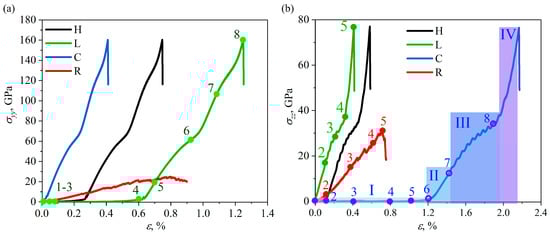 Stress-strain curves under uniaxial tension along y-axis (a) and z-axis (b) for all structures under consideration. The main points on the stress-strain curves are labeled by dots and numbers 1–8. Structural states at these points are further analyzed. Stress-strain curve for cellular GA is divided into four regions I–IV to characterize the different deformation mechanisms. All the results are presented for H (honeycomb), L (lamellar), C (cellular), and R (random) GAs..