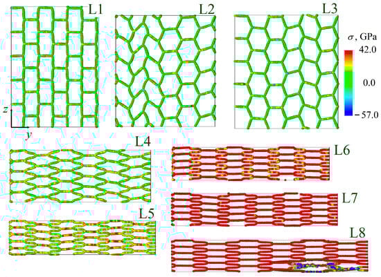 Figure 4 and Figure 5 present the stress per atom () during tension along y-axis (z-axis) of all the GAs under investigation. For deformation along y-axis, all the structural changes can be explained based on the snapshots for lamellar GA (corresponding strain is marked by points in the stress-strain curve). At first, rectangular cells start to transform to the hexagonal. Oscillation of the hexagons took place up to = 0.5: some are rotated (L2), some are opened (L3), with continuous changing of their shape. Finally, all the cells transform to the hexagons (L3) and start to collapse during further tension (L4). For all the considered structures, folding and buckling of the graphene occurred. From point L3 we can also describe the deformation behavior of the honeycomb GA (black curve in Figure 3a). From point L4 we can describe also the deformation behavior of cellular GA (blue curve in Figure 3a). At = 0.6, the hexagons cannot be collapsed any further and the graphene nanoribbons aligned with the tensile direction are stressed. Further, deformation is mainly defined by the stretching of the walls of GA cells parallel to the tensile direction. The initial length of the wall is 12 Å and unchanged up to L5. It is increased to 16 Å before the fracture occurred. The analysis of the interatomic bonds inside the basal plane of graphene walls showed that for walls along the x-axis, the lattice parameters remained almost unchanged until L5. The bonds almost aligned with the loading direction are mostly strained. These bonds (and others of the same orientation) are continuously changing from 1.41 Å to 1.7 Å. Point L6 is the pre-critical stress, when all the graphene walls are considerably loaded. Fracture occurred on one of the graphene walls aligned with the tensile direction.