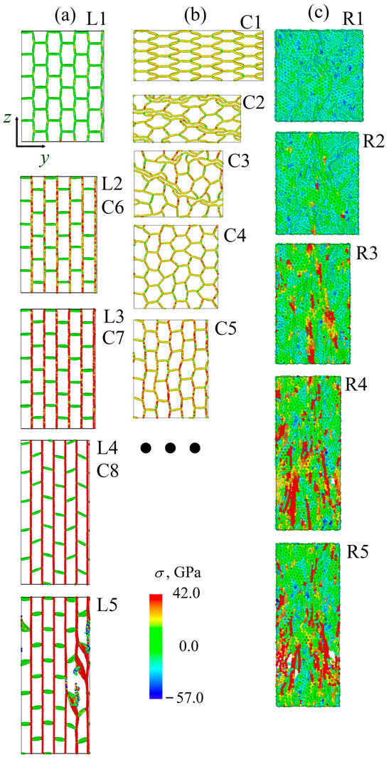 Stress per atom during tension along z-axis. Here, L—lamellar GA, R—random GA, C—cellular GA. Number corresponds to the numbers on the stress-strain curves in Figure 3.
