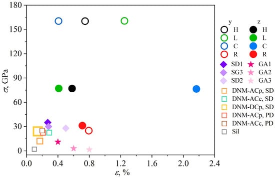 Ultimate strength and fracture strain of GA configurations in comparison with other results (circles). Tensile strain and strength for SD1, SG3, SD2 are taken from [], for GA1-GA3 from [], for Sil from [], for DNM from []. The obtained in the present work results are presented for H (honeycomb), L (lamellar), C (cellular), and R (random) GAs.