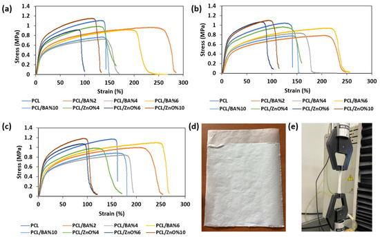 Stress–Strain graphs of specimens. (a) Stress–Strain graph of the first specimens. (b) Stress–Strain graph of the second specimens. (c) Stress–Strain graph of the third specimens. (d) Tensile test setup for fabricated fibers. (e) Electrospun mat with 6% ZnO.