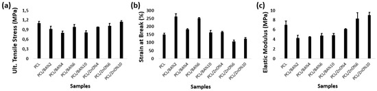 When incorporating BA particles into the fibers, there is an initial decrease in the elastic modulus compared to fibers containing only PCL. However, as the BA percentage in the fiber increases, the elastic modulus also increases (Figure 1). On the contrary, an increase in the amount of ZnO leads to an increase in the elastic modulus. This increase was statistically significant (p < 0.05). The highest values for ultimate tensile stress and elastic modulus were observed in fibers containing 10% ZnO. When looking at elongation percentages and the overall behavior of the fibers, all of them exhibit ductile properties. Nonetheless, fibers containing BA exhibit greater elongation compared to those containing ZnO, and these fibers with 6% BA showed the highest tensile strength following the fibers with 10% ZnO, and greatest elongation (Figure 2). ANOVA results confirmed that changes in tensile strength and strain were statistically significant (p < 0.05). There also was a statistically significant difference found between the BA and ZnO decorated groups (p < 0.05). The observed increase in both elastic modulus and ultimate tensile strength in fibers containing 10% ZnO is attributed to the role of ZnO as a reinforcing agent within the microstructure of the PCL nanofibers. This enhancement in mechanical properties is likely due to the dispersion of ZnO within the polymer matrix. FTIR analysis showed no new chemical bond formation between PCL and ZnO, suggesting that the reinforcement is primarily physical [37]. It was discovered that the inclusion of particles can considerably enhance the elastic modulus and yield fiber strength. Tjong et al. [38] related the mechanism of strength enhancement to the effect of nanoparticles on the restricted movement of polymer chains. According to Bugnicourt et al. [39], the interaction between polymer molecules and nanoparticles during deformation greatly reduces their mobility, hence promoting an enhancement in elastic modulus.