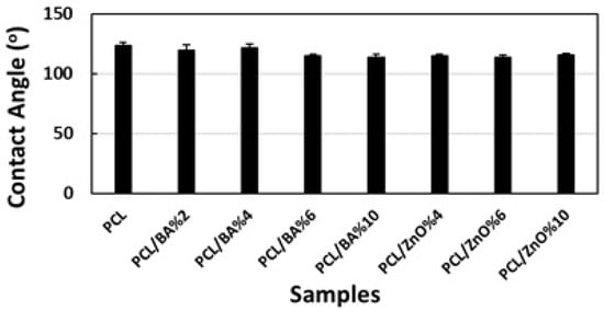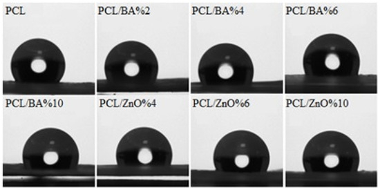 Contact angle values of electrospun nanofiber with different amounts of BA and ZnO.