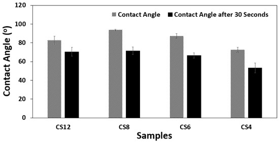 In wound dressing applications, hydrophilic behavior is desired from hydrogel material to keep the environment moist, and absorb the excess fluid generated in the wound area. For this purpose, contact angle studies were also conducted for hydrogel samples prepared with various chitosan and PVA amounts. The contact angles were measured for hydrogel samples both initially, when the drop touched the gel, and after 30 s. Fabricated hydrogels exhibited hydrophilic nature, and water uptake behavior can be observed from the drop in contact angle values after 30 s, which indicates the high water absorption property of the gels (Figure 6 and Figure 7). Due to the abundance of hydroxyl groups in the PVA molecule, with increasing the PVA ratio, the hydrophilicity has improved. This fact can be observed from contact angle results in addition to water uptake properties of the hydrogels. Also, FTIR and water uptake properties of the hydrogels suggest the same results.
