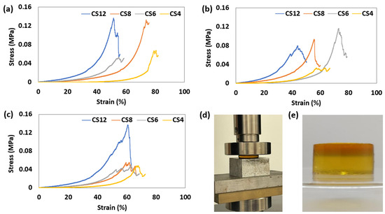 Stress–Strain graphs of specimens for compression test. (a) Stress–Strain graph of the first specimen. (b) Stress–Strain graph of the second specimen. (c) Stress–Strain graph of the third specimen. (d) Compression test setup for fabricated hydrogels. (e) A sample for compression test.