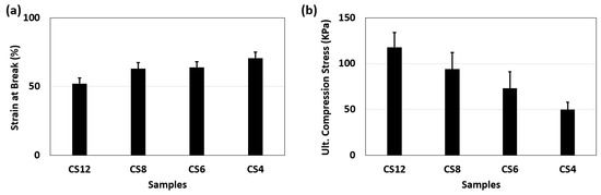 The compression test results clearly suggest that the CS12 hydrogel exhibits the highest strength among the listed hydrogels. It was noticed that a decrease in the chitosan content, coupled with an increase in PVA, leads to a decrease in the ultimate compressive stress. However, the ductility of gels increases as the amount of PVA rises. In summary, as the quantity of chitosan rises, the material becomes sturdier and more prone to brittleness. Conversely, an increase in PVA content results in reduced strength with reduced brittleness, thus meaning that increased elongation at breakage (Figure 8 and Figure 9). These findings suggest that PVA might inhibit the cross-linking of chitosan, a deduction supported by the FTIR test results. Additionally, the higher hydrophilicity of PVA compared to chitosan likely increases the samples’ fluidity, leading to a less robust hydrogel structure. However, these differences in the compression test were not statistically significant since the p-value was found to be greater than 0.05. This suggests that more datasets should be collected for future experimentation.