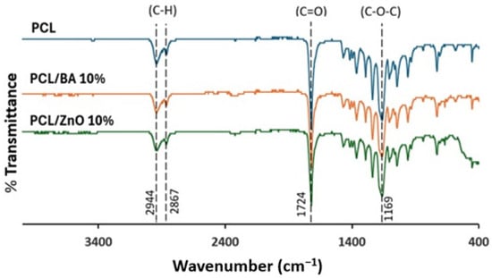 The chemical interactions of PCL, BA, and ZnO were investigated using FTIR spectroscopy. This analysis proved that the addition of BA and ZnO into PCL solution did not cause any structural change in PCL, suggesting that there was no chemical interaction between these chemicals (Figure 10). Distinct peaks at 1724 and 1169 cm−1 are assigned to –C=O and C–O–C bonds (stretching) in ester bonds for PCL, respectively. Furthermore, peaks at 2944 and 2867 cm−1 are assigned to anti-symmetric methylene–oxygen (CH2–O) and symmetric methylene groups (CH2–), respectively [41], indicating the presence of common functional groups in the polymer. Except for the PCL peaks, no new bonds were observed in PCL/BA or PCL/ZnO, indicating that no chemical reaction occurred during the mixing of these materials. Furthermore, there was no shift in peaks in PCL/BA or PCL/ZnO with respect to PCL, indicating that the relative decreases in transmittance were caused by a progressive decline in PCL concentration due to modest amounts of added BA and ZnO. Considering the desired antifungal and antibacterial activity of BA and ZnO for ROS formation and cell membrane disturbance mechanisms, maintaining these chemical characteristics makes these electrospun fiber mats a potential material in wound dressing applications.