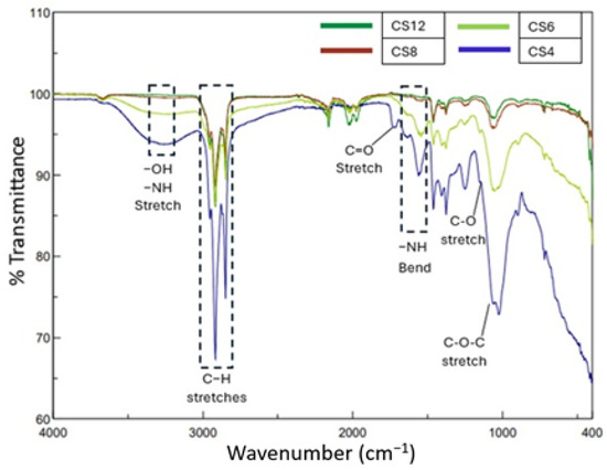 FTIR Spectra of samples CS12, CS8, CS6, and CS4.
