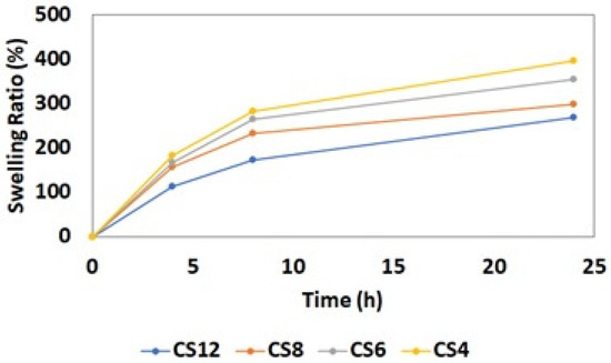 For the initial examination of biodegradable materials, fluid absorption experiments are crucial. To assess fluid uptake, previously dried gels were placed in a 1% (w/v) saline solution and incubated at room temperature for a period of 24 h. During this incubation, the weights of the gels were checked at the 4, 8, and 24 h marks. The use of saline solution aimed to replicate conditions like sweat. Following varying durations of immersion, the specimens were delicately extracted from the medium, and following the removal of surplus water using filter paper, their weight was measured to ascertain the wet weight in relation to the immersion duration. Swelling ratio (SR) is given by Equation (1):