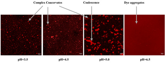 Confocal Laser Scanning Microscopy (CLSM) was employed to identify coacervate formation and visually investigate the structure of the CMC–gelatin coacervate system with a total biopolymer concentration of 0.1% (w/w) prepared at various pHs. The pH was gradually decreased through dropwise addition of acetic acid of 50%, 10%, or 2% w/v. As shown in Figure 2, coacervates appeared as spherical particles within the sample structure in samples prepared at pH 3.5, 4.5, and 5. Similar morphologies have been reported for complex coacervates [31]. No particles were detected in the sample prepared at pH 6.5 except for very bright points, which is likely due to dye aggregation, which were visible in all images. These findings confirm the absence of complex coacervation at pH 6.5, supporting the turbidity testing results. Additionally, at pH 5, which is within the optimum coacervation range, coacervates appeared larger in size, and particle coalescence was observed (as highlighted in the figure). At this pH, coacervates were distributed less uniformly, with a greater involvement of gelatin in their formation. As a result, fewer non-interacted gelatin molecules remained to create a strong and isotropic hydrogel.
