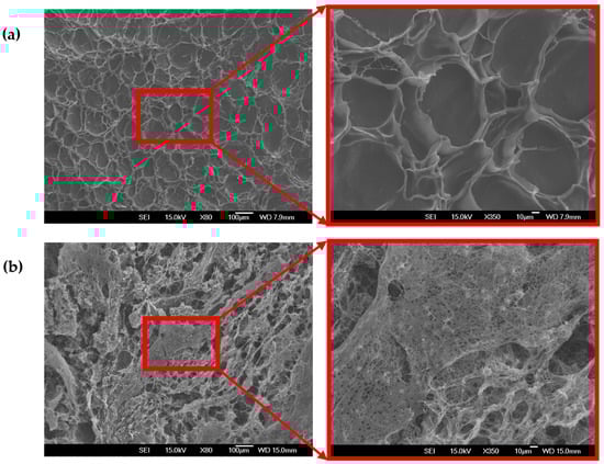 As displayed in Figure 3, freeze-dried samples, called cryogels, exhibited a more sponge-like, porous structure. Figure 3a illustrates the less compact structure and larger pores of the cryogels prepared at pH 5.0 compared to samples prepared at pH 3.5, with high porosity and smaller micro-voids shown in Figure 3b. The formation of highly porous solid foams resulting from complex coacervation has been reported in several studies [19,32].