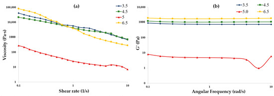 The shear rheometric behaviors of CMC–gelatin samples at a 1:20 ratio and 4% biopolymer content at a pH of 3.5, 4.5, 5.0, and 6.5 at constant amplitude under increasing shear rate and angular frequency are shown in Figure 4a. The samples exhibited pseudoplastic behavior. Notably, the pH 6.5 sample demonstrated the largest viscosity at low shear rates. In contrast, samples prepared at a pH of 3.5, 4.5, and 5.0 showed lower viscosities at low shear rates. For all samples, shear rates exceeding 1 s−1 resulted in a decrease in apparent viscosity. This reduction is likely due to the applied forces overcoming the intra- and intermolecular forces within the polymer network, as well as the alignment of polymer chains in the direction of flow.