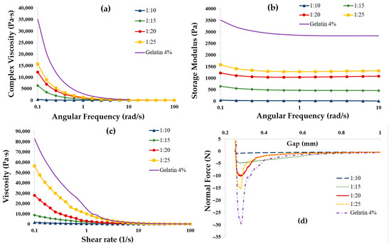 The complex viscosity and controlled shear viscosity (illustrated in Figure 5a and Figure 5c, respectively) indicate a decrease in viscosity with an increase in total CMC content. All coacervates exhibited shear-thinning behavior, showing a viscosity of 45 ± 15 Pa·s at a shear rate of 100 s−1. The viscosity measurements at a shear rate of 0.1 s−1 for coacervate samples with CMC–gelatin ratios of 1:25, 1:20, 1:15, and 1:10 were recorded as 5.6 × 104, 2.8 × 104, 8.6 × 103, and 1.5 × 103 Pa·s, respectively. Overall, all coacervate samples exhibited viscosity levels that were significantly lower than those of the gelatin alone.