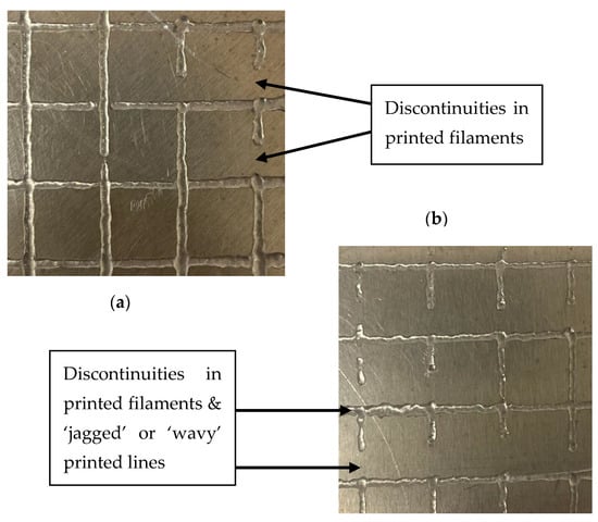 The parameters used for extruding the grid structure are shown in Table 2. For each sample, the pressure was initially set to 1.0 PSI. This pressure was incrementally increased until optimal flow behavior was observed for each sample. The nozzle speed was also adjusted between samples. After determining the optimal parameters, three repetitions of a grid pattern were extruded and analyzed. Examples of deposition failures are presented in Figure 8, while the measured printability of each sample, along with images of successful prints, is detailed in Figure 9. Printability is a common measure of how successfully materials are able to be extruded found by comparing the physical dimensions of an extruded shape to its intended dimensions. All prints shown in Figure 8 and Figure 9 were obtained using parameters detailed in Table 2.