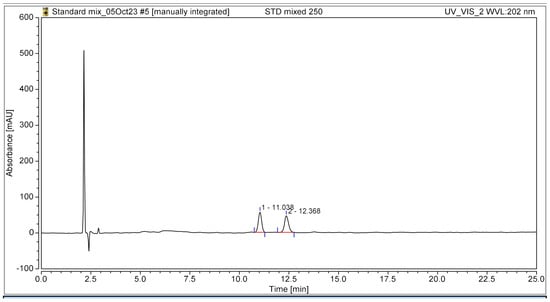 To assess system suitability, crucial chromatographic parameters such as retention time, resolution, theoretical plate count, separation factor, retention factor, asymmetry, and tailing factor were evaluated for active compounds. A standard mixture of 60 µg/mL was injected to determine these system suitability parameters. The resolution between the two peaks was found to be 3.09 ± 0.25, indicating well-separated peaks. Additionally, the values for peak resolution, theoretical plates, separation factor, retention factor, asymmetry, and, tailing factors were within adequate limits, as displayed in Table 6.