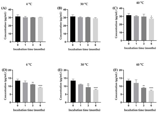 The concentration of β-amyrin (A–C) and stigmasterol (D–F) in the YTPS-FFS after 6 months of stability study at three different storage conditions (4, 30, and 40 °C). Results are expressed as the mean ± SD based on analysis of triplicate samples (n = 3). The data were analyzed by GraphPad Prism version 9.5.0 with one-way ANOVA and Dunnett’s multiple comparisons test (statistical significance denoted by * p < 0.05, ** p < 0.01 and **** p < 0.0001 compared with initial concentration).