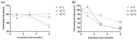 The degradation kinetics of (A) β-amyrin and (B) stigmasterol at three different storage conditions (4, 30, and 40 °C) Results are expressed as the mean ± SD based on analysis of triplicate samples (n = 3). The data were analyzed by GraphPad Prism version 9.5.0 with one-way ANOVA and Dunnett’s multiple comparisons test (statistical significance denoted by * p < 0.05, ** p < 0.01, and **** p < 0.0001 compared with % remaining at initial concentration).