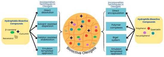 The incorporation of hydrophilic bioactive compounds into oleogels poses unique challenges due to their poor solubility in oil phases. In recent years, different techniques have been employed to successfully incorporate these compounds while maintaining their stability and functional properties. These methods include (a) direct encapsulation, (b) polymer complexes, and (c) the bigel system [,,,,].