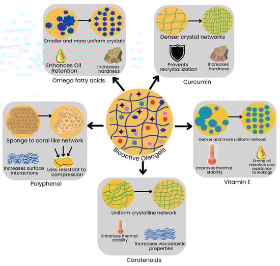 The incorporation of bioactive compounds like polyphenols, carotenoids, omega fatty acids (n-3, n-6, and n-9), and vitamins within oleogels creates unique interactions that influence the gel’s structural, mechanical, and nutritional properties (Figure 2). Polyphenols are known for their strong antioxidant activity. Polyphenols (e.g., catechins, quercetin, curcumin) interact with oleogelators to enhance the oxidative stability of the gel. Oleogelators like wax-based or phytosterol-based systems can encapsulate polyphenols, protecting them from oxidation. However, sometimes, these stronger bonds of oleogels may reduce the bioavailability of polyphenols during digestion. A previous study by Giacintucci et al. [] focused on oleogel preparation with extra virgin olive oil and ethylcellulose and their interaction with polyphenols. In this study, atomic force microscopy revealed that as polyphenol content was reduced from olive oil, the oleogel structure transitioned from a sponge-like to a coral-like pattern. This means the oleogel network became more irregular, with uneven and extended pores. This demonstrates the role of oil polarity and polyphenols in maintaining oleogel network stability []. Another study by Ciuffarin et al. [], based on calorimetric analysis, also reported that polyphenols play a key role in stabilizing the oleogel network. The researchers employed differential scanning calorimetry (DSC) to measure the thermal transitions and melting enthalpy of oleogels prepared with varying polyphenol levels. DSC revealed broader melting peaks at lower temperatures for oleogels without polyphenols, indicating weaker networks. Additionally, the presence of polyphenols increased the melting temperature and stabilized the network by creating additional junction points in the crystalline structure. For instance, in monoglyceride-based oleogels, reduced polyphenol content resulted in a more irregular and weaker network prone to melting, while in rice bran wax-based oleogels, polyphenols contributed to the formation of two distinct crystal fractions, providing enhanced structural stability. Further, PLM showed that polyphenols influence crystal morphology, transitioning from irregular structures to more organized networks. These findings underline the importance of combining calorimetric and microscopic techniques to explain the structuring role of polyphenols in oleogels [].
