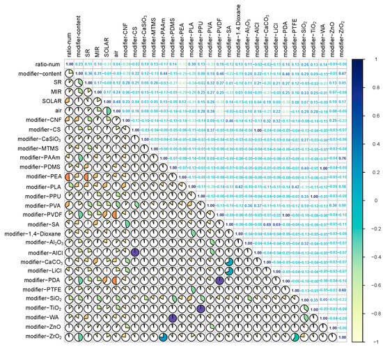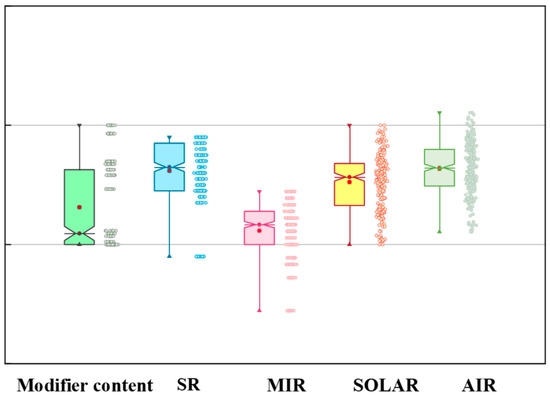 Based on a systematic literature review and data collection, we established a dataset encompassing 31 variables. The descriptive analysis of the collected data employed one-hot encoding for the matrix material types and modification material types, while the modifier content, solar reflectance, infrared emissivity, solar irradiance, and ambient temperature were represented using quartile-based box plots (Figure 2). Each box plot comprised the following five numerical points: minimum observation (lower whisker), 25%, median, 75%, and maximum observation (upper whisker). For detailed numerical ranges and a complete statistical analysis of all features, please refer to Table S1 in the Supplementary Materials.