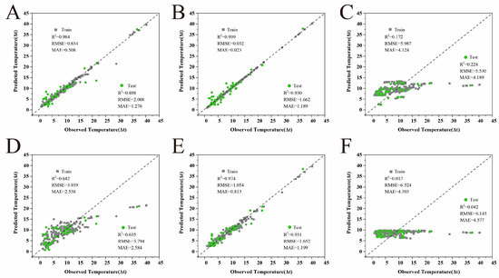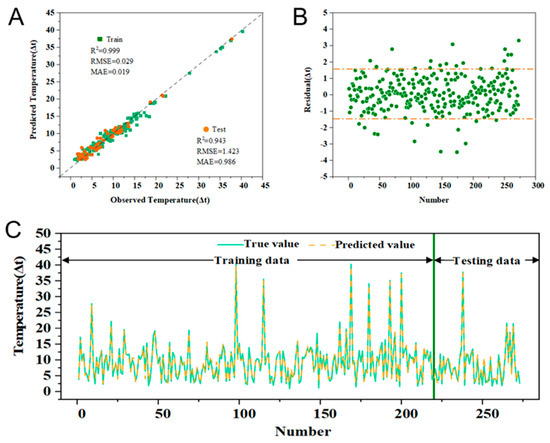 Specifically, the optimized model achieved improved R2 values of 0.999 and 0.943 on the training and test sets, respectively, while the RMSE values decreased to 0.029 and 1.423 and the MAE values reduced to 0.019 and 0.986. Figure 5B illustrates the residual distribution between the predicted and actual values, with predictions on the x-axis and residuals (actual minus predicted values) on the y-axis. The residual plot revealed a relatively random distribution pattern [23], with most residuals concentrated within ±1.5 °C and uniformly distributed around the zero line. This distribution pattern indicated the absence of systematic bias, with prediction errors showing no significant trends relative to the predicted values.
