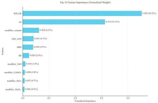 Among the material design parameters, modifier content ranked third at 6.2% importance, indicating its significant influence on material performance modulation. The material composition ratio (ratio_num) and MIR contributed 4.1% and 3.9% importance, respectively, suggesting that the matrix material composition and infrared radiation characteristics [27] were also substantial factors. Solar reflectance (SE) showed 2.4% importance, which, although relatively small, remains significant for optimizing daytime cooling efficiency.