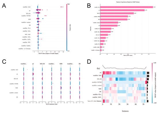 Figure 7A presents global feature importance, with the ZnO modifier showing the highest average SHAP value (1.523), indicating its predominant influence on cooling performance. This could be attributed to ZnO’s unique optical and structural characteristics [29]. Its high emissivity in the mid-infrared region (8–13 μm) enhances aerogel thermal radiation in the atmospheric window band, while the incorporation of ZnO nanoparticles increases solar radiation reflection through scattering and reflection mechanisms while maintaining the aerogel’s porous structure, thereby reducing solar energy absorption. This finding complemented the previous feature importance analysis, revealing ZnO’s crucial role at the microscopic level. Environmental parameters (air and SOLAR) ranked second and third, with SHAP values of 1.299 and 0.979, respectively, reconfirming the significance of environmental conditions.