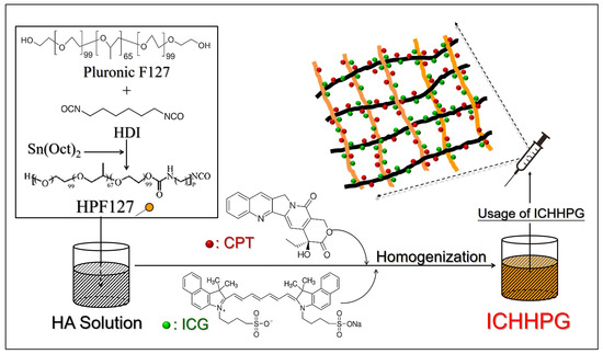 Hydrogel-mediated drug delivery may provide a feasible method to handle and stabilize multiple agents, such as ICG and chemo-drugs, in the transport system. In this study, we aimed to develop an injectable and thermoresponsive hexamethylene diisocyanate (HDI)-PF127-hyaluronic acid (HA) composite hydrogel bearing ICG and camptothecin (CPT), called ICHHPG, for the photochemotherapy of skin cancer after surgery. CPT is an FDA-approved anticancer drug which can change the structure of Topoisomerase I to inactivate the transcription function of cancer cells, leading to apoptosis accordingly [31]. HA is employed because there is overexpression of HA receptor CD44 on tumor cells, suggesting that HA is suitable for use in anticancer drug delivery [32]. In this paper, the fabrication, characterization, and in vitro anticancer functionalities of ICHHPG are investigated stepwise.