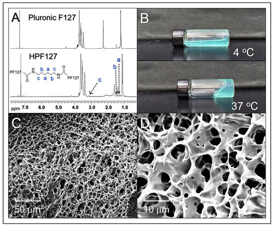 (A) The 1H NMR spectra of PF127 and the synthesized HPF127. The a, b, and c at 1.3, 1.5, and 3.2 ppm in the HPF127 spectrum represent the methylene protons of aliphatic chain of HDI. (B) Photographs of the real ICHHPG samples under 4 or 37 °C. (C,D) SEM images displaying the surface (C) and inner structure (D) of ICHHPG at 2000X (C) and 10,000X (D) magnification, respectively.