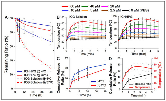 Thermal stability and functionality of ICHHPG in vitro. (A) Quantitative analyses of the amount of ICG remaining in DI water or ICHHPG under incubation at 4 or 37 °C within 48 h. * p < 0.05. (B) Hyperthermia effects of free ICG (left) and ICHHPG (right) under NIR exposure for 5 min. (C) CPT release profiles of ICHHPG under 4 or 37 °C within 48 h. (D) CPT release profile of ICHHPG under 5 min of NIR irradiation (black curve). The red curve indicates the temperature variation in the system within 5 min NIR exposure. Values in (A–D) are the mean ± SD (n = 3). * p < 0.05.