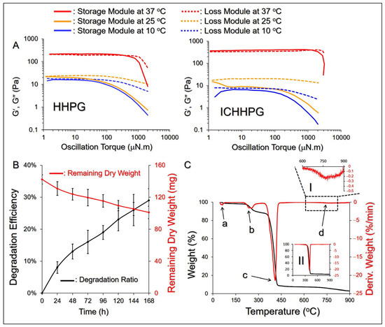 Physicochemical properties of ICHHPG. (A) Curves of storage modulus (G′) and loss modulus (G″) vs. oscillation torque for HHPG (left) and ICHHPG (right) under 10, 25, or 37 °C. (B) Degradation (black) and dry weight variation (red) profiles of ICHHPG under incubation in 37 °C PBS for 7 days. Values are the mean ± SD (n = 3). (C) TGA (black) and DTG (red) curves of ICHHPG heated from 40 to 900 °C with an increasing rate of 10 °C/min under a nitrogen environment. a, b, c, and d points indicate the four peaks on the DTG profile. The inset diagrams show the magnified DTG curve of ICHHPG on 600–900 °C (I) and the whole TGA as well as DTG profiles of HHPG (II).