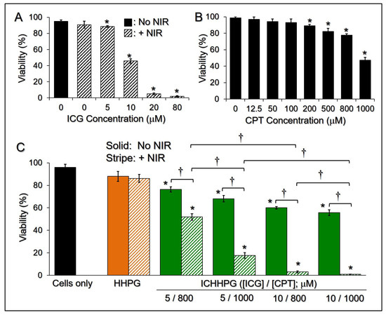 Cytotoxicity of ICHHPG to melanoma in vitro. (A,B) Viabilities of the B16F10 cells after treatment with various concentrations of ICG + NIR (A) or CPT (B) for 24 h. Values are the mean ± SD (n = 3). * p < 0.05 compared to the group without treatment. (C) Viabilities of the B16F10 cells 24 h after treatments with ICHHPG in various conditions. Values are the mean ± SD (n = 3). * p < 0.05 compared to the group without treatment (cells only). † p < 0.05.