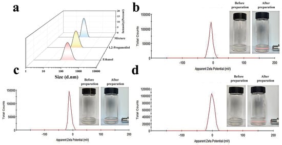 Appearance and characterization of three ethosomes. (a) Particle size distribution of three ethosomes. (b) Appearance and zeta potential distribution of ethanol ethosome. (c) Appearance and zeta potential distribution of 1,2-propanediol ethosome. (d) Appearance and zeta potential distribution of mixture ethosome.