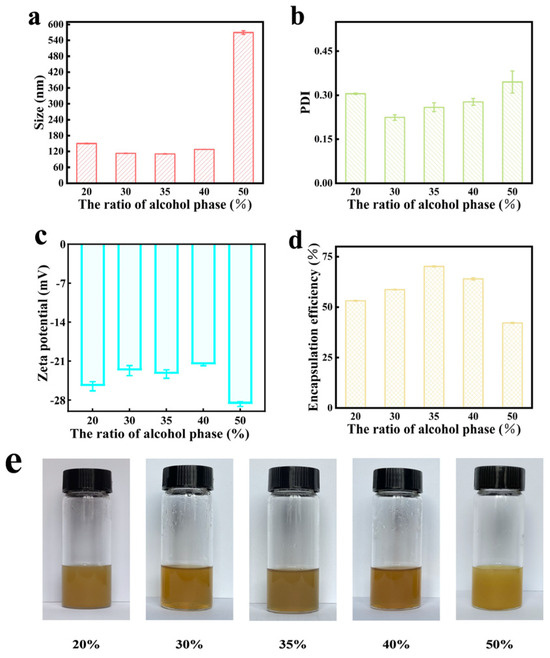 Effect of alcohol ratio on the total flavonoid ethosome of Vernonia anthelmintica. (a) Effect of alcohol ratio on size of total flavonoid ethosome. (b) Effect of alcohol ratio on PDI of total flavonoid ethosome. (c) Effect of alcohol ratio on zeta potential of total flavonoid ethosome. (d) Effect of alcohol ratio on encapsulation efficiency of total flavonoid ethosome. (e) Appearance of total flavonoid ethosome with different alcohol ratio.