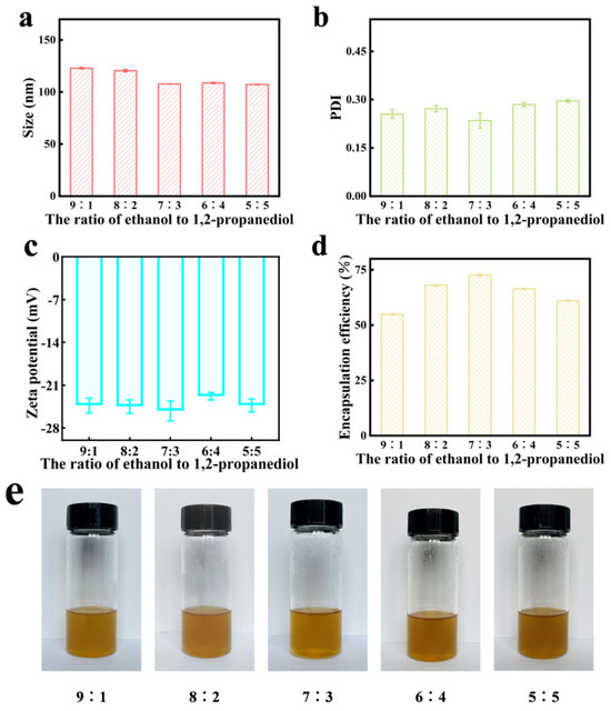 Effect of ethanol/1,2-propanediol ratio on the total flavonoid ethosome. (a) Effect of ethanol/1,2-propanediol ratio on size of total flavonoid ethosome. (b) Effect of ethanol/1,2-propanediol ratio on PDI of total flavonoid ethosome. (c) Effect of ethanol/1,2-propanediol ratio on zeta potential of total flavonoid ethosome. (d) Effect of ethanol/1,2-propanediol ratio on encapsulation efficiency of total flavonoid ethosome. (e) Appearance of total flavonoid ethosome with different ethanol/1,2-propanediol ratios.