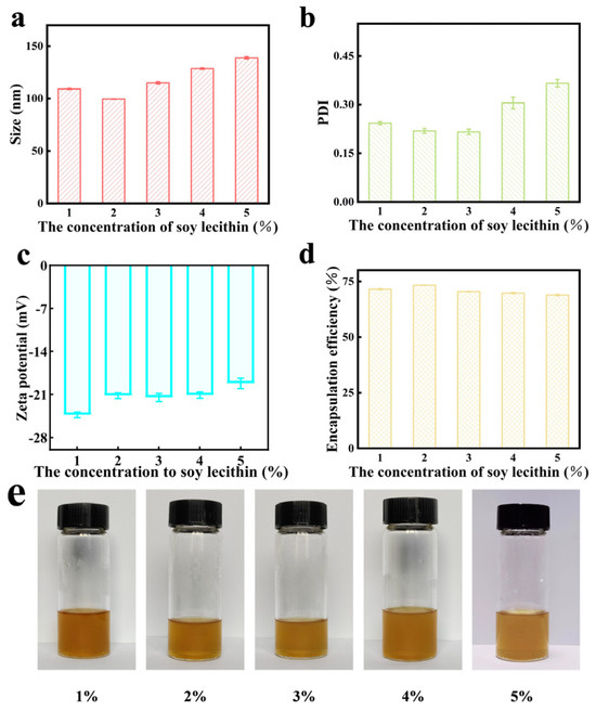 Effect of soy lecithin concentration on the total flavonoid ethosome of Vernonia anthelmintica. (a) Effect of soy lecithin concentration on size of total flavonoid ethosome. (b) Effect of soy lecithin concentration on PDI of total flavonoid ethosome. (c) Effect of soy lecithin concentration on zeta potential of total flavonoid ethosome. (d) Effect of soy lecithin concentration on encapsulation efficiency of total flavonoid ethosome. (e) Appearance of total flavonoid ethosome with different soy lecithin concentrations.