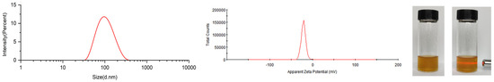 A total of 0.20 g of soybean phospholipids, 0.04 g of cholesterol, and 6 mg of purified total flavonoids were incorporated into a solution comprising 3.5 mL of ethanol/1,2-propanediol, with varying ethanol/1,2-propanediol ratios of 9:1, 8:2, 7:3, 6:4, and 5:5. Following this, 6.5 mL of distilled water was added slowly while maintaining magnetic stirring at a temperature of 35 °C and a speed of 600 rpm. After stirring for one hour, the resulting suspensions were subjected to ultrasonic treatment in an ice bath using a cell disruptor (130 W, ultrasonic for 10 s with a 15 s pause) for 30 min. The mixtures obtained were then filtered through membranes with pore sizes of 0.45 μm and 0.22 μm. The encapsulation efficiency was evaluated, and the sample’s particle size, PDI, and zeta potential were assessed after being diluted 20-fold with distilled water. In a subsequent experiment, 6 mg of purified total flavonoids was combined with a suitable amount of soy lecithin and cholesterol in a ratio of 5:1. The soy lecithin concentration was varied at 1%, 2%, 3%, 4%, and 5%. These components were dissolved in a 3.5 mL ethanol/1,2-propanediol mixture (7:3 ethanol/1,2-propanediol ratio) while stirring magnetically at 35 °C at a rate of 600 rpm. After gradually adding 6.5 mL of distilled water, the mixture was hydrated for one hour. Ultrasonic treatment was again applied to the suspensions using a cell disruptor (130 W, ultrasonic for 10 s with a 15 s interval) for 30 min in an ice bath. The final mixtures were filtered through 0.45 μm and 0.22 μm membranes. The encapsulation efficiency was calculated, and measurements of the particle size, PDI, and zeta potential were made after diluting the samples 20 times with distilled water.