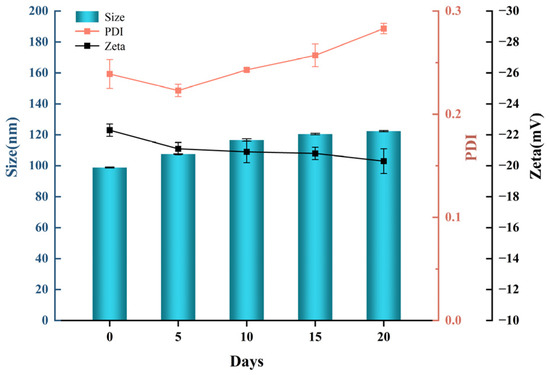 In order to study the stability of drug-laden ethosome, we observed the particle size, dispersion uniformity, and potentiometric values of ethosome vesicles at specific time intervals. As shown in Figure 8, the particle size of drug-laden ethosome increased with time, by about 20 nm, compared to freshly prepared formulations. This increase may be due to the adhesion of some ethosome vesicles. From day 5, the PDI gradually increased but remained below 0.3, and the negative zeta potential value of drug-laden ethosome decreased slightly, indicating a uniform distribution of ethosome vesicles and a stable structure of ethosome.