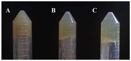 According to the 2020 edition of the Pharmacopoeia of the People’s Republic of China, a gel agent should be homogeneous and delicate, stay gelatinous at room temperature, and not become dry or liquefied [30]. In this study, the quality of the gel was evaluated based on formability, viscosity, homogeneity, spreadability, skin feel, and appearance, and was scored according to Table 6. The higher the score, the better the quality of the gel.