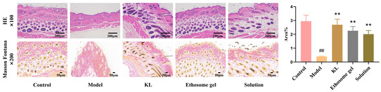 Through H&E staining and Masson Fontana staining of skin tissue sections (Figure 12), it is evident that the model group exhibited the lowest melanin levels in the skin, the KL group had the highest content, and the solution and ethosome gel groups had visible therapeutic effects. The increase in melanin content in the ethosome gel group compared to the solution group proved that the ethosome gel group could improve the therapeutic effect of the drug on vitiligo.