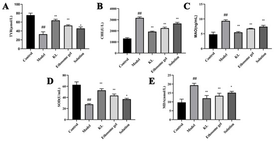 Effects of ethosome gel on serum index in model mice. (A) Effects of ethosome gel on TYR. (B) Effects of ethosome gel on CHE. (C) Effects of ethosome gel on MAO. (D) Effects of ethosome gel on SOD. (E) Effects of ethosome gel on MDA. Data were evaluated using one-way ANOVA (mean ± SD, n = 6). ## p < 0.01 vs. control. * p < 0.05, ** p < 0.01 vs. model.