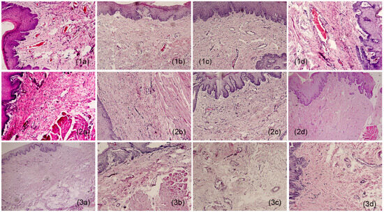 Histological appearance of samples: 1 (a–d) film, 2 (a–d) surgery, and 3 (a–d) controls. a = week 4; b = week 8; c = week 12; d = week 16. 10×.